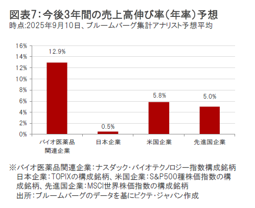 バイオ医薬品関連企業の売上高は、堅調に成長してきました。(図表6参照)バイオ医薬品関連企業については、引き続き多くの有望な治療薬候補を有しており、新薬承認後の業績寄与が期待されていることから、今後3年間で年率+12.9%の相対的に高い売上高の伸びが予想されています。(図表7参照)
