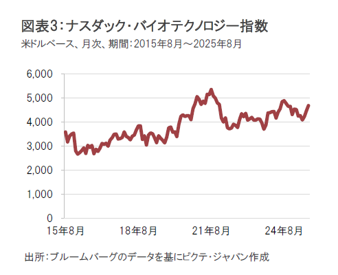 バイオ医薬品株式市場は、米国金利の変動や米トランプ政権の関税政策などを背景とした景気見通しの不透明感、米食品医薬品局(FDA)の再編の動き、米トランプ政権による薬価引き下げの動きへの懸念などの影響を受けて、変動が大きくなっています。2023年に大型案件が多くみられたM&A(合併・買収)の動きは、2024年は低迷しましたが、2025年は回復傾向にあります。引き続き大手の医薬品企業や大手のバイオ医薬品企業が大型治療薬の特許問題に直面し、パイプラインの強化が求められていることもあり、2025年後半にかけても増加が期待されます。フェーズ2で良好な治験結果が示された治療薬候補を有するなど買収後のリスクの低い銘柄が注目されますが、アンメットメディカルニーズの大きな分野においてパイプラインを有する銘柄も関心を集めるとみています。新薬の開発では、画期的な新薬の開発が続いており、AI(人工知能)の進化が、さらに開発を加速するとみています。また米国食品医薬品局(FDA)が、医療ニーズが満たされていない適応症の治験については柔軟な姿勢を示していることも治療薬の開発を支援するものと考えます。さらに、資金調達については、新薬の開発が順調な企業では引き続きスムーズに進められています。一方、IPO(新規株式公開)は依然として低調な状況が続いています。引き続き米国の金融政策、マクロ経済の動向、米トランプ政権の政策動向には注視が必要と考えます。