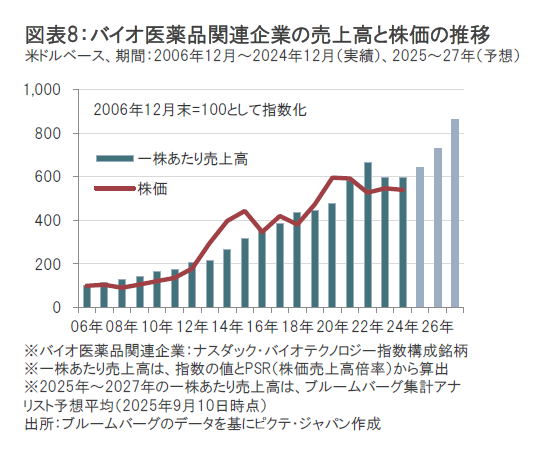 過去の実績では、バイオ医薬品関連企業の株価は、売上高の伸びとともに上昇してきたことがわかります。(図表8参照)