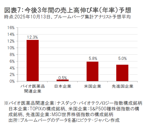 バイオ医薬品関連企業の売上高は、堅調に成長してきました。(図表6参照)バイオ医薬品関連企業については、引き続き多くの有望な治療薬候補を有しており、新薬承認後の業績寄与が期待されていることから、今後3年間で年率+12.3%の相対的に高い売上高の伸びが予想されています。(図表7参照)