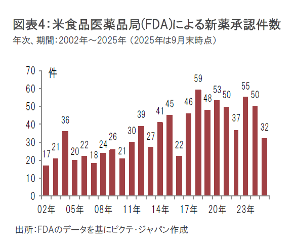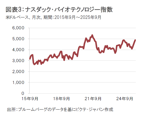 バイオ医薬品株式市場は、米国金利の変動や米トランプ政権の関税政策などを背景とした景気見通しの不透明感、米食品医薬品局(FDA)の再編の動き、米トランプ政権による薬価引き下げの動きへの懸念などの影響を受けて、変動が大きくなっています。2023年に大型案件が多くみられたM&A(合併・買収)の動きは、2024年は低迷しましたが、2025年は回復傾向にあります。引き続き大手の医薬品企業や大手のバイオ医薬品企業が大型治療薬の特許問題に直面し、パイプラインの強化が求められていることもあり、2025年後半にかけても増加が期待されます。引き続き、フェーズ2で良好な治験結果が示された治療薬候補を有するなど買収後のリスクの低い銘柄が注目されますが、アンメットメディカルニーズの大きな分野においてパイプラインを有する銘柄も関心を集めるとみています。新薬の開発では、画期的な新薬の開発が続いており、AI(人工知能)の進化が、さらに開発を加速するとみています。またFDAが、医療ニーズが満たされていない適応症の治験については柔軟な姿勢を示していることも治療薬の開発を支援するものと考えます。さらに、資金調達については、新薬の開発が順調な企業では引き続きスムーズに進められています。