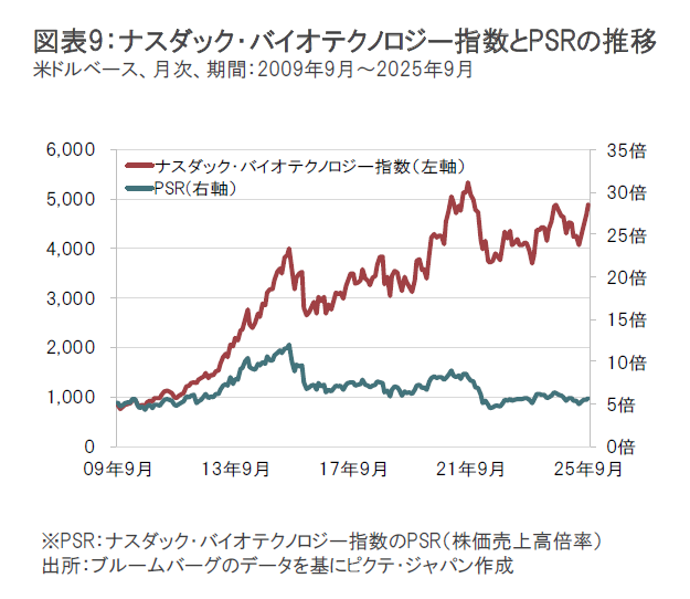 バイオ医薬品企業の業績が景気動向に左右されにくい特性などが注目されて2021年夏頃までは株価が上昇し、PSR(株価売上高倍率)で見たバリュエーション(投資価値評価)の水準も上昇していましたが、2021年秋以降は新薬承認申請に対するFDAの予想外の決定などがマイナス要因となったことに加え、2022年半ばにかけてナスダック市場の下落が大きくなる中、ナスダック・バイオテクノロジー指数も下落したことからPSRも低下し、その後、低水準で推移しています。(図表9参照)