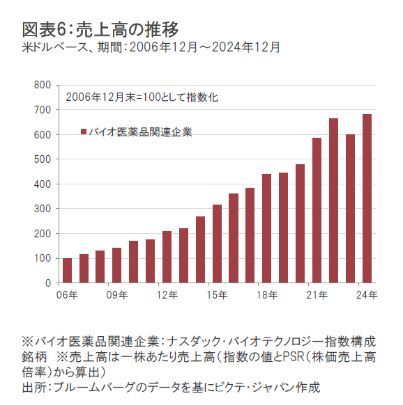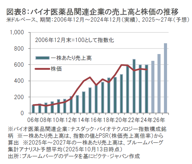 過去の実績では、バイオ医薬品関連企業の株価は、売上高の伸びとともに上昇してきたことがわかります。(図表8参照)