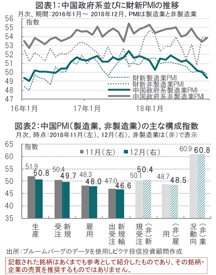 なお、中国国家統計局が18年12月31日に発表した12月の製造業PMIは49.4と、市場予想(50.0)、前月(50.0)を下回りました。一方で12月の非製造業(サービス業)PMIは53.8と、市場予想(53.2)、前月(53.4)を上回り、財新PMIと同様に、製造業と非製造業で明暗が分かれました。