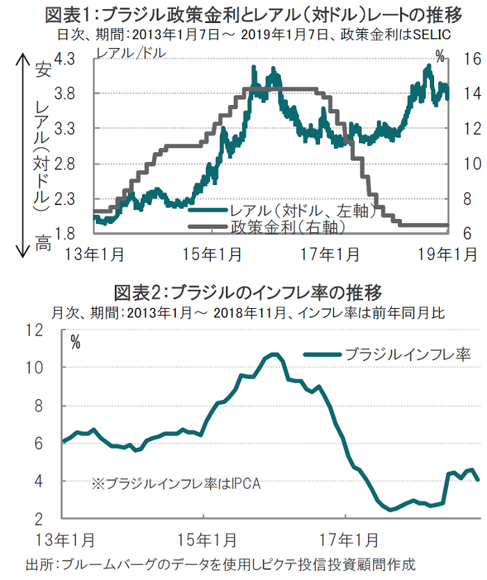 ボルソナロ大統領の就任演説では、汚職撲滅などへの意気込みは高い一方、構造改革など財政政策の詳細は多くを語っていないなど、不透明な面は見られますが、それでも、既に公表された主要閣僚の指名メンバーの顔ぶれから、改革への期待が高まっています。昨年10月の決選投票におけるボルソナロ氏の得票率は55%程度でしたが、足元の世論調査では7割以上が新政権への期待を示しています。