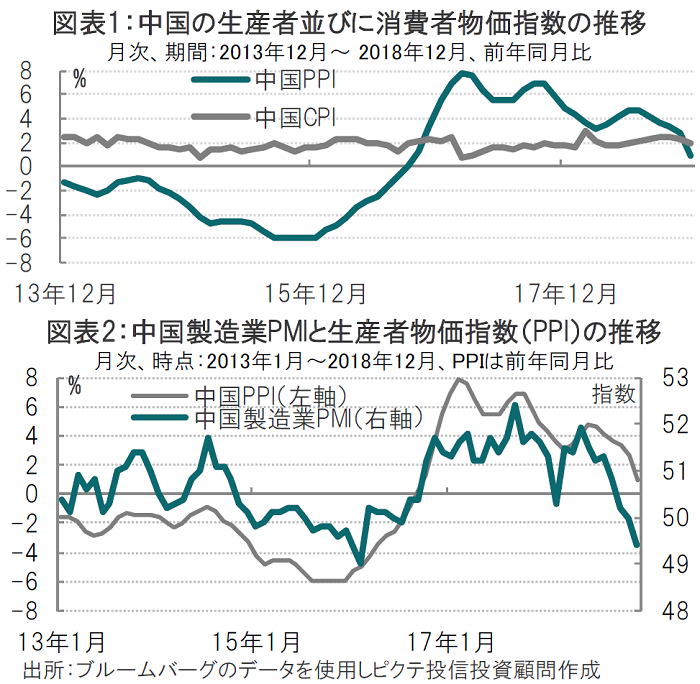 12月の中国物価指標でPPIの大幅な落ち込みと、CPIの低下が確認されました。そのため、18年秋頃の中国のインフレ率上昇懸念は後退しました。一方、中国経済と連動する傾向が見られるPPIが急速に低下している点については注意が必要です。