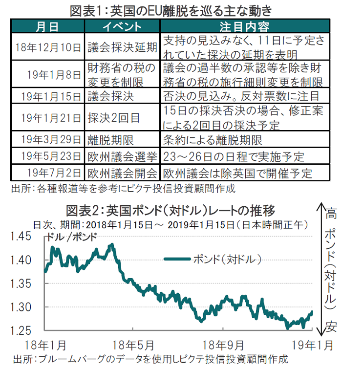 英国議会(下院)は2019年1月15日に、欧州連合(EU)との離脱合意案の是非を採決する予定です。市場予想では、与野党双方に合意案への反発が強く、否決される公算が高まっています(図表1参照)。