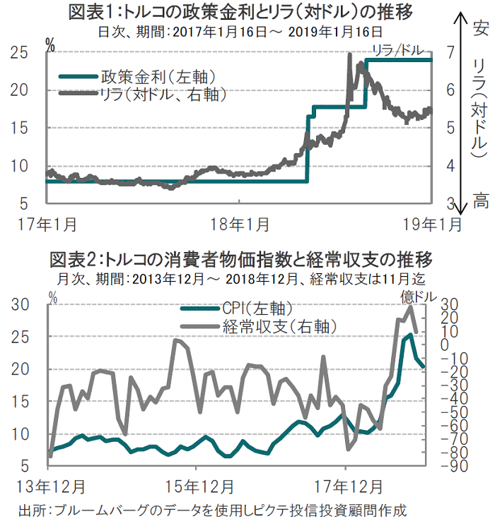 トルコ中央銀行は2019年1月16日、市場予想通り政策金利を24%で据え置くと発表しました(図表1参照)。チェティンカヤ総裁率いるトルコ中央銀行は18年9月に引き上げ幅で6.25%の大幅な利上げを実施した後、3会合連続で政策金利を据え置いています。