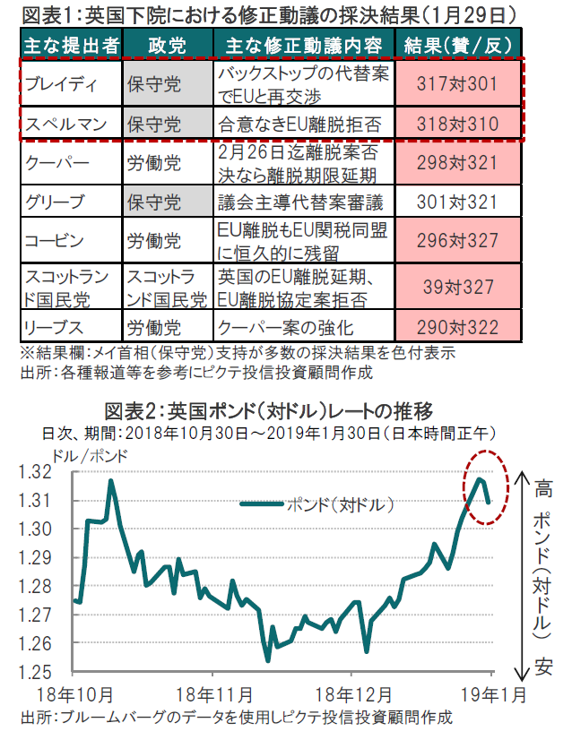 英国下院で2019年1月29日、英国の欧州連合(EU)離脱合意案に対する7の修正案に採決が行われました(図表1参照)。賛成多数で可決された動議(修正案)は2つで、主に労働党などが提案した動議は否決されました。