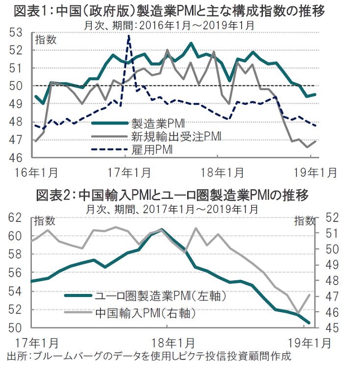 中国国家統計局が2019年1月31日に発表した1月の政府版製造業PMIは49.5と前月の49.4から上昇しました(図表1参照)。ただ、景気の拡大・縮小の節目となる50を引き続き下回っています。同指数を構成する項目別指数のうち、新規輸出受注は46.6から46.9に改善しました。