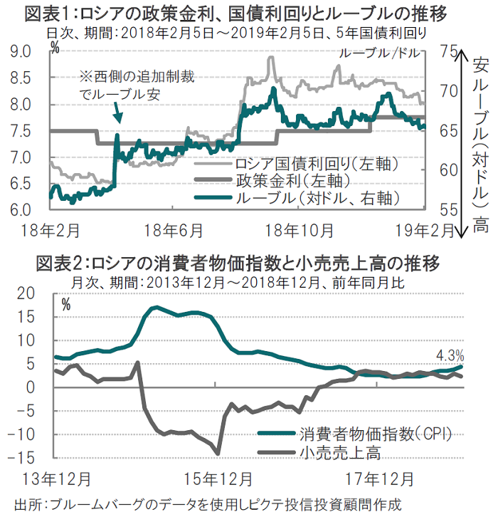 今週、ブラジル、メキシコ、インド、ロシアなどの主要新興国で金融政策会合が予定されています。ロシアはルーブル安への対応などで18年後半から2回利上げを実施しています(図表1参照)。前回(18年12月)は市場予想(据置き)に反し利上げを実施しました。今回の金融政策会合では、利上げよりは据置きを見込んでいます。