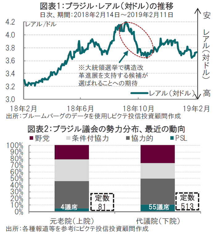 ボルソナロ新政権の構造改革に向けた滑り出しは好調です。所属する社会自由党(PSL)は少数ながら、上院、下院とも政策に(一部条件付)協力する政党は7割を超えています(図表2参照)。年金改革には憲法改正が必要で上院、下院共に6割の賛成が必要ですが、現在の協力姿勢が維持されるならば法案可決の可能性が期待されます。