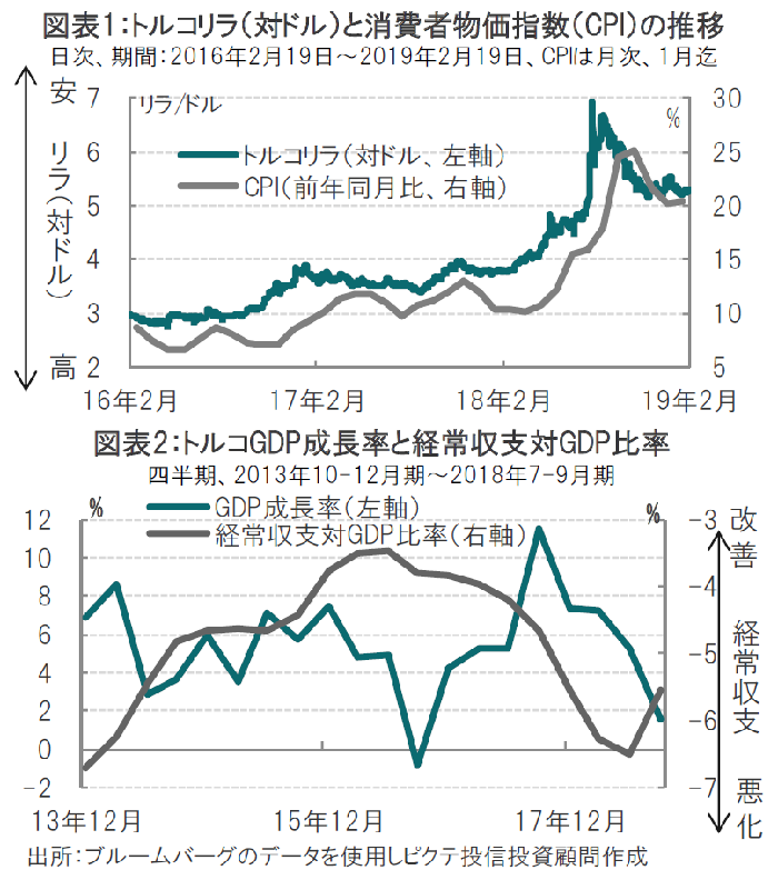 チェティンカヤ総裁は金融政策の変更を否定していることもあり、預金準備率の引き下げが通貨リラに与えた影響は限定的でした(図表1参照)。確かに目先、利下げなど金融政策の変更は考えにくいものの、市場の一部には将来の利下げ観測も見られます。早ければ、年後半にトルコ中銀の姿勢に変化があるかもしれませんが、次の点で、当面は据え置きがメインシナリオと思われます。