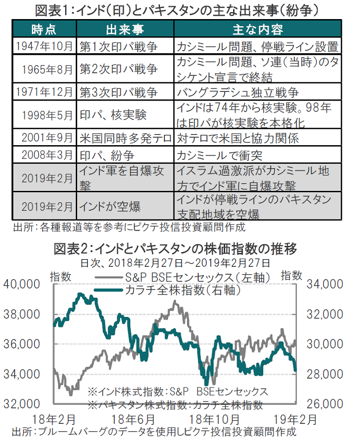 インドとパキスタンの間で、互いに空爆を発表するなど軍事的な緊張が高まっています。2019年2月14日、インド北部カシミール州でインド治安部隊に自爆テロが発生、多数が死亡した件についてイスラム過激派「ジェイシモハメド」が犯行声明を出しています。インドはテロにパキスタンが関与したとして、同国に付与していた最恵国待遇を取りやめ、関税を課すなど関係が悪化しています(図表1参照)。
