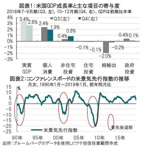 米商務省が2019年2月28日に発表した18年10-12月期の実質GDP(国内総生産)速報値は、前期比年率で2.6%増と、市場予想(2.2%増)を上回るも、前期(7-9月期)の3.4%増を下回りました(図表1参照)。