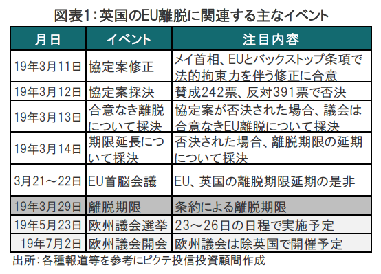 今後の展開を占うと、メインシナリオは図表1に沿えば、次に「合意なき離脱」についての採決が行われ(これは恐らく否決)る予定です。その後、3月29日のEU離脱期限延長について採決が行われる予定です。延長期間は欧州議会のスケジュールから5月もしくは6月末が有力と見られます。