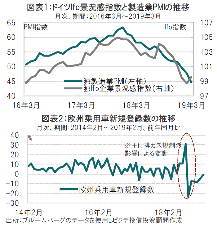 ドイツのPMIが軟調となった背景のひとつは自動車産業の不振です。新たな排ガス規制の影響で昨年9月は大幅に売上が落ち込みました(図表2参照)。自動車の不振は短期的との観測に反し、乗用車の販売は前年比でプラスを回復していないなど、排ガス規制の影響は既に一巡したと見られるものの、回復ペースは鈍いままとなっています。