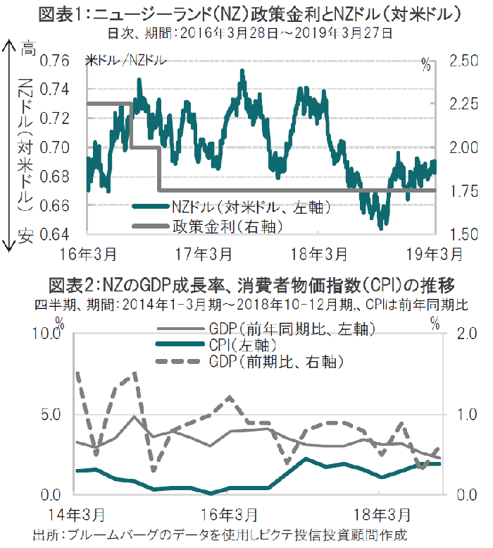 次に、足元のNZドル高傾向も懸念要因で、声明文でもNZドル高に言及しています。背景として金融政策の姿勢の違いを指摘しています。NZドルは、年初の米国の利上げ停止示唆を受け上昇ました。3月月初、隣国オーストラリア(豪)の18年10-12月期GDPが市場予想を下回り、豪中銀のハト派観測が台頭し、NZドルは上昇傾向となりました(図表1参照)。