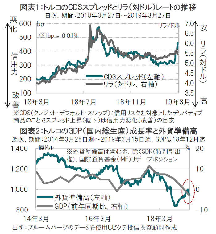 トルコのエルドアン大統領は2019年3月24日、統一地方選を3月31日に控え不安定な動きを見せた通貨リラの急落(3月22日)を受け(図表1参照)、「行き過ぎたドル需要や誤解を与える為替レート予想に責任があると見なされるバンカーは選挙後に高い代償を払うことになる」と警告しました。