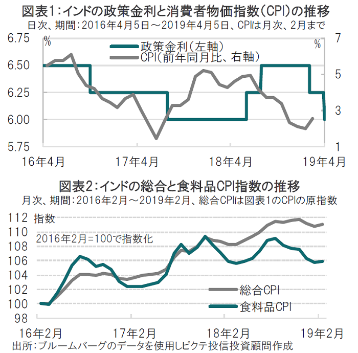 インド中銀は声明で、利下げの背景として国内経済が主に海外からの逆風に直面していると指摘しています。また、インド中銀はインフレ率見通しを下方修正しました。例えば、19年度前半(19年4-9月)のインフレ率見通しを2月時点の3.2-3.4%から2.9-3.0%へ引き下げました。