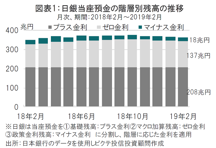 副作用軽減の具体策として市場が想定しているのは階層別当座預金金利です。当座預金を(階層に)分けて、マイナス金利を適用する階層と、適用しない部分に分別し、マイナス金利の対象を限定する仕組みです。日銀は16年に3段階の階層別金利を導入しています(図表1参照)。