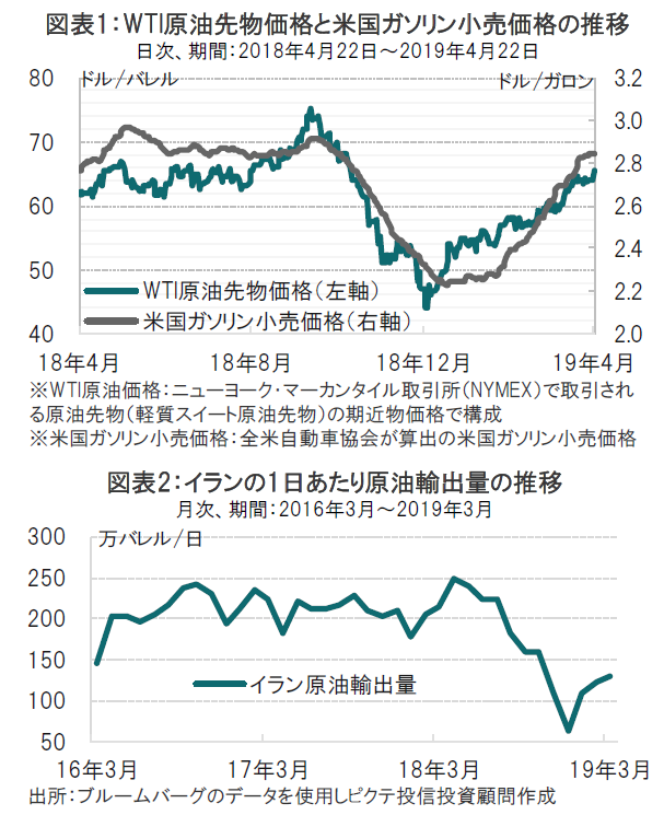 次に、産油国が、手際よく、増産の可能性を示唆している点です。例えば、サウジアラビアやアラブ首長国連邦(UAE)は150万バレル/日程度の増産は短期間に可能と表明しています。イランの輸出がゼロとなっても影響が無い数字が報道されています。原油価格は、リビアやベネズエラの生産停止などを背景に足元上昇傾向で、それに伴い米国国民が過敏に反応するガソリン価格も上昇しています。昨年トランプ大統領が原油市場に「高過ぎる」とコメントした水準に近づいているだけに(図表1参照)、自らの政策で原油価格が上昇することに配慮が払われると見られます。