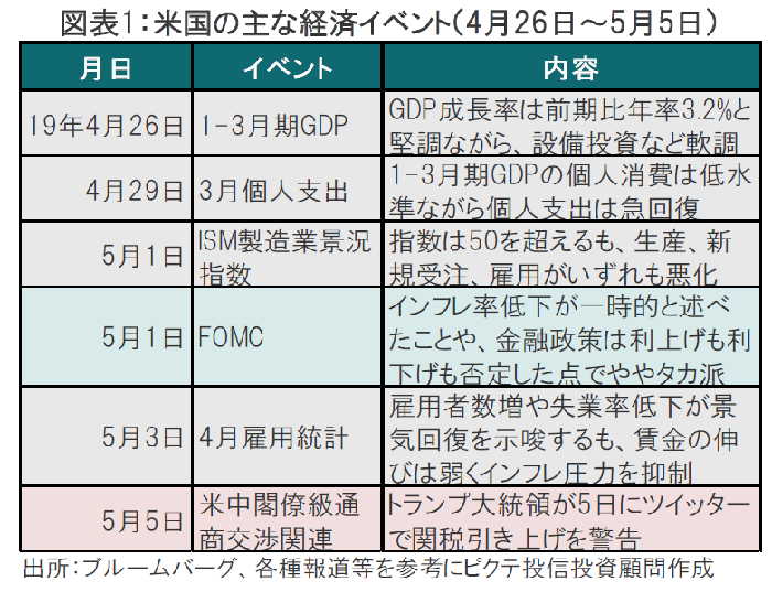 日本の大型連休の頃、米国では主要な経済指標の公表や、米連邦公開市場委員会(FOMC)が開催され金融政策が公表されました(図表1参照)。