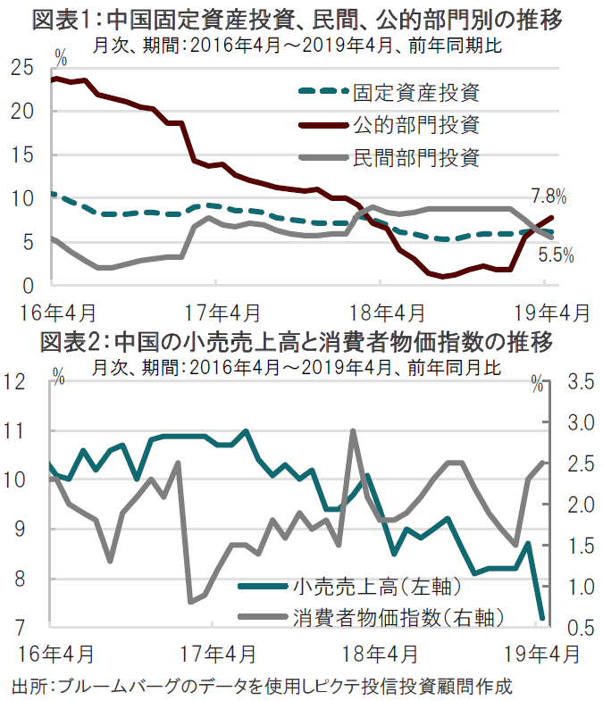1-4月の都市部固定資産投資は前年同期比6.1%と市場予想(6.4%)、前月(6.3%)を下回りました(図表1参照)。部門別に見ると、政府など公的部門の投資の伸びが拡大する一方、民間の伸びは鈍化が続いています。