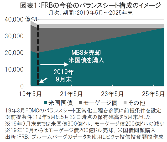 図表1は、FRBのバランスシートを米国国債、住宅ローン担保証券(MBSまたはモーゲージ債)、その他(一定と仮定)に単純化し、19年9月までは、米国債、MBS共に縮小(売却)し、その後は米国債とMBSを同額売買する様子を示しています。MBSを米国債に入れ替えるにあたり、米国国債の満期構成を市場の構成にあわせる①か、短期化する②かの議論が議事要旨に示されています。②はFRBが11年にバランスシート保有国債の残存期間の長期化(ツイストオペ)に着手しましたが、反対のオペレーションを行うイメージです。