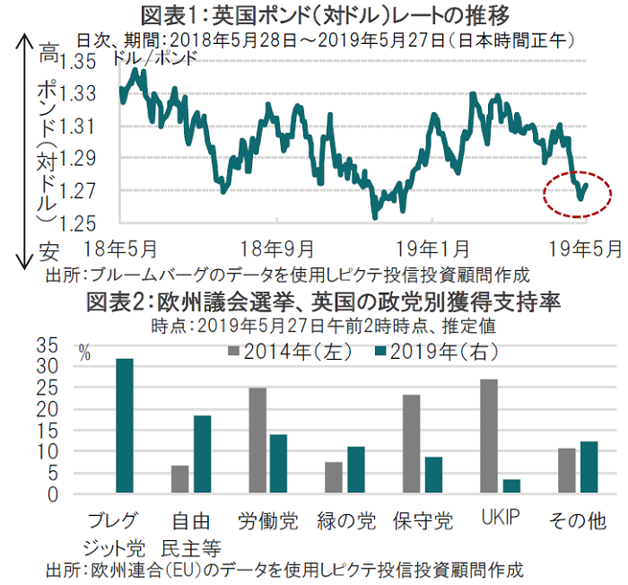 メイ首相の辞任表明などを背景に、英国のEU離脱の先行きに不透明感が高まり、ポンドは下落傾向です(図表1参照)。もっとも、細かく見るとメイ首相が辞任を表明してからポンドは小幅ながら反発しており、メイ首相辞任など悪材料を消化しつつ、次の展開に目を向け始めているともみられます。