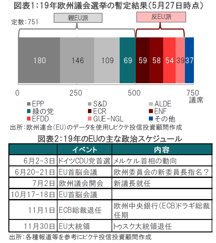 欧州議会選挙(5年毎、前回は14年)が2019年5月23日~26日に実施されました。親欧州連合(EU)支持派のEPP(欧州人民党)は180議席(暫定結果、図表1参照)と前回から議席を減らすも、第1党を維持しました。