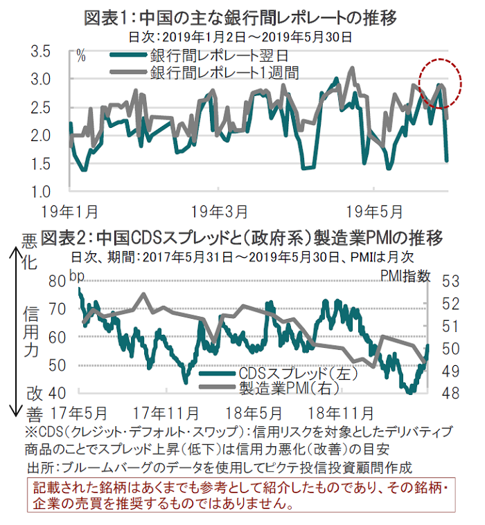 大雑把な話しながら、中国の景気回復が鈍いのも気がかりです。31日に公表された5月の製造業購買担当者景気指数(PMI)は49.4と市場予想の49.9を下回る軟調な結果でした(図表2参照)。米中通商交渉の悪化など、景気を悪化させる要因が根強い中、景気回復の鈍さが中国の信用力を将来的に悪化させるリスクに、無関心になるべきでは無いと見ています。