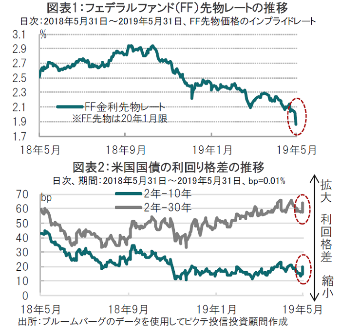トランプ大統領がメキシコからの全輸入品への関税賦課を示唆したことや、米金融当局の発言などを背景に、米政策金利の動向を反映するフェデラルファンド(FF)金利先物が年内利下げの確信度合いを高めました(図表1参照)。