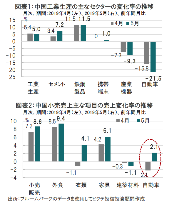 もっとも、中国政府は4月から増値税(付加価値税)を引き下げ、自動車メーカーにかかる税率は16%から13%に下がりました。これにあわせ多くの新車価格が2~3%程度引き下げられた模様です。5月の小売売上高で自動車を見ると前年比でプラスの2.1%と、ようやく回復の兆しが見られました。政府のてこ入れという点では、工業生産のセメントや鉄鋼が回復しており、債務削減にしばらく目をつぶる姿勢がうかがえます。