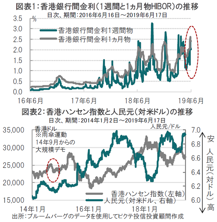 逃亡犯条例改正案を契機とした香港の大規模デモの背景として、中国の香港支配の圧力が高まっていることへの抗議と見られます。デモの規模は97年の香港返還以降最大といわれていますが、市場への影響として銀行間金利の動向を見ると(図表1参照)、現段階では比較的落ち着いています。ただ、デモの長期化には注意も必要です。