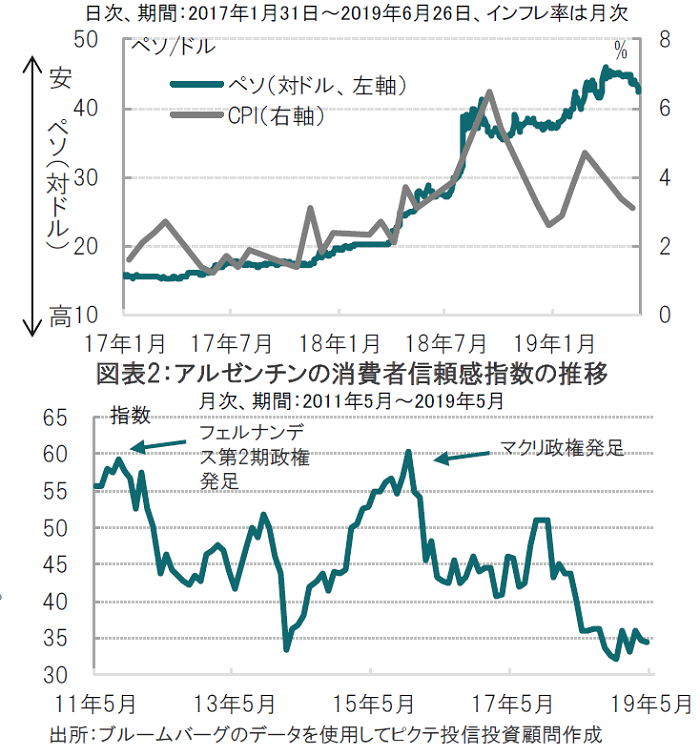 なお、世論調査との相関が高い消費者信頼感指数の動向を見ると低水準での推移となっています(図表2参照)。発足後の支持率は7割程度と見られていたマクリ政権ですが、支持率は足元まで低下傾向です。それにしても政治とは複雑です。国外から見るとIMF支援は必要と思われますが、国内から見ると緊縮策を進めるとしてIMFは不人気です。