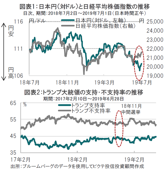 まだ時間があるとはいえ、米国では来年11月に大統領選挙が控えています。トランプ大統領の支持率に底堅さは見られますが、下院で負けた昨年11月の中間選挙と代わり映えしない状況です(図表2参照)。関連は不明ですが最近のトランプ大統領は、イランなどやや唐突感のある問題に取り組んでいるようにも見えます。G20後の米朝会談はサプライズでした。非核化問題に踏み込めるかは不透明ですが、政治的なアピールとしては成果があったと見られます。