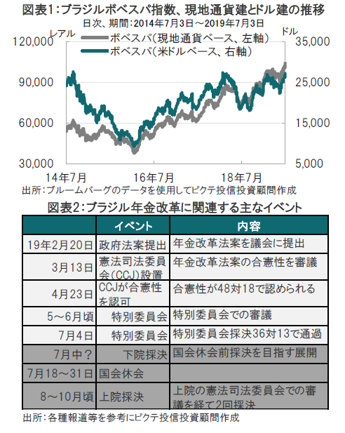 ブラジル市場が堅調な背景は年金改革法案の審議が概ね順調に進展していることです(図表2参照)。2019年7月4日には下院特別委員会の暫定採決が可決しました。これにより、7月中の下院採決に希望が残されました。