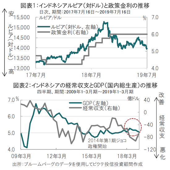 インドネシア銀行(中央銀行)は2019年7月18日に金融政策決定会合の開催を予定しています。市場予想では、政策金利を現在の6.00%から5.75%へ引き下げるとの見方が大半となっています(図表1参照)。