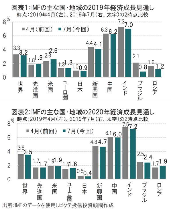 国際通貨基金(IMF)は2019年7月23日に世界経済見通し(WEO)を公表しました。19年の世界成長率を3.2%、20年を3.5%と見込み、いずれも前回(4月時点)の予測から0.1ポイント下方修正しました(図表1、2参照)。