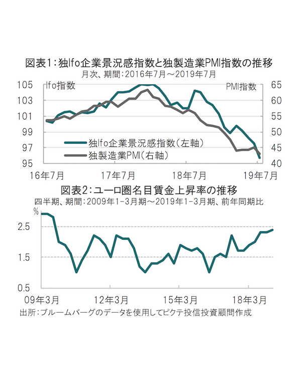 そこで、注目された景気認識を取りあげます。市場ではドイツの景気後退が意識(懸念)されています。ドイツ中央銀行は4-6月期の成長率がマイナスとなる可能性を示唆しています。また、24日に公表された7月のドイツ製造業購買担当者景気指数(PMI)は43.1と市場予想を下回りました(図表1参照)。政策理事会の数時間前に公表された独Ifo企業景況感指数は95.7と、2013年以来の低水準でした。これらを受け、市場はECBが景気後退懸念を共有することを期待(希望?)していましたが、ドラギ総裁は会見で景気後退の可能性は低いと述べた背景として次の要因が考えられます。