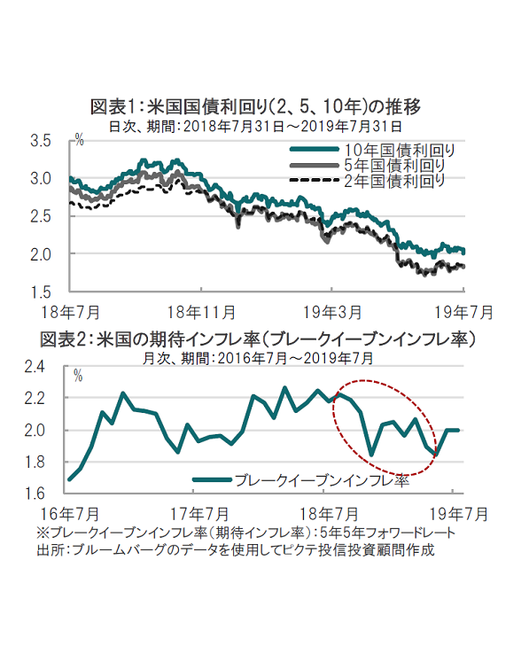 次に、インフレ率の低下懸念も利下げの理由としています。市場で測定される期待インフレ率(ブレークイーブンインフレ率)は低下傾向であったことなどが懸念の背景と見られます(図表2参照)。しかし、足元期待インフレ率は底打ちも見られます。声明文でも市場ベースの期待インフレ率に対する表現が、前回から若干上方修正されています。