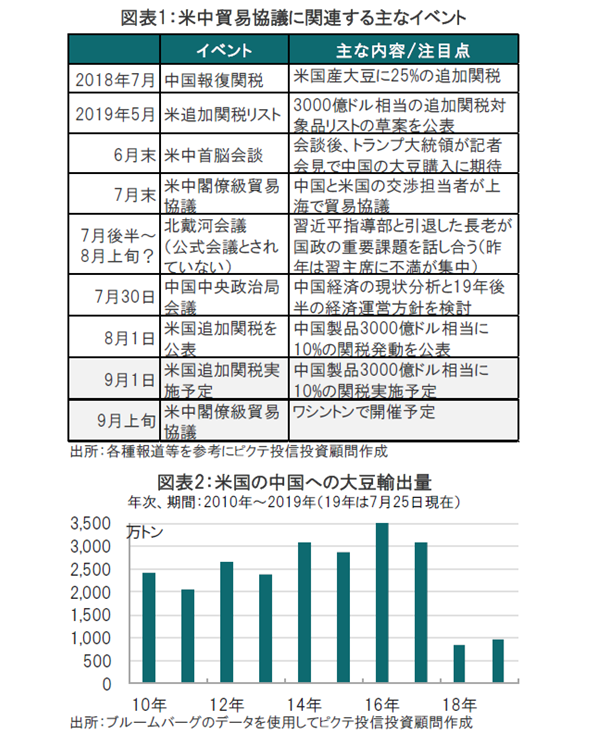 米国トランプ大統領は2019年8月1日、現時点で制裁関税の対象となっていない中国からの輸入品3000億ドル(約32兆2300億円)相当に10%の関税を課すとツイッターで発表しました(図表1参照)。中国との貿易戦争のエスカレートが懸念されます。