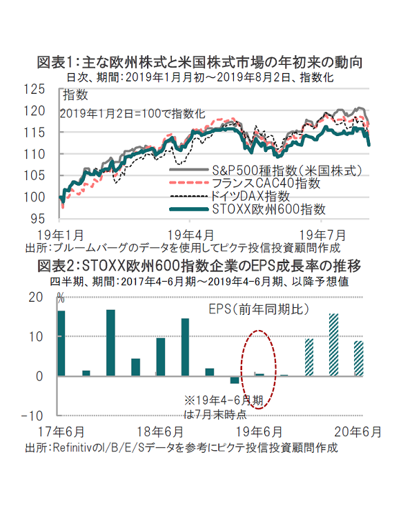 欧州企業の4-6月期決算報告の進捗度合いは7月末時点で約3分の1程度です。途中経過ながら4-6月期のEPS(一株当たり利益)は前年同期比小幅のプラスで推移しています(図表2参照)。事前の市場予想では欧州株式のEPSは前年同期比マイナス(各種レポートからマイナス4%程度)が見込まれていたことに比べれば、水準は低いものの、コンセンサスとの比較から底堅いとの評価もできそうです。