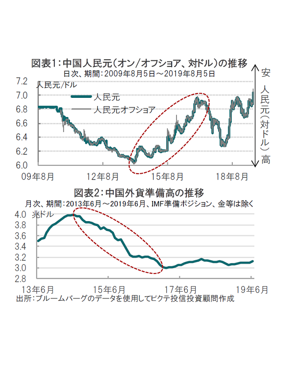 ただ、極端な人民元安は中国からの資本逃避を加速させる恐れがあります。15~16年頃の人民元安局面(図表1参照)で中国当局は、外貨売り人民元買い介入の結果、外貨準備を大幅に減らしています(図表2参照)。資本逃避のリスク覚悟で通貨安政策をさらに加速させる可能性は高くないように思われますが、注意は必要です。