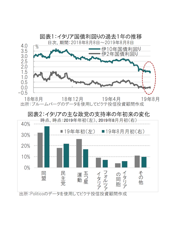 総選挙は、ポピュリスト連立政権を担う同盟のサルビーニ氏が、反エスタブリッシュメント(既存勢力)を掲げる政党「五つ星運動」との連立を解消する意向を表明したもので、政局の不透明感を受け、イタリア国債利回りは上昇(価格は下落)しました(図表1参照)。