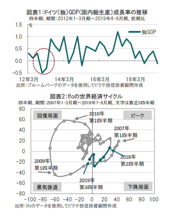 ドイツ連邦統計局が2019年8月14日に発表した4-6月期のGDP(国内総生産)速報値は、前期比マイナス0.1%と市場予想(マイナス0.1%)に一致しました(図表1参照)。前期はプラス0.4%でした。