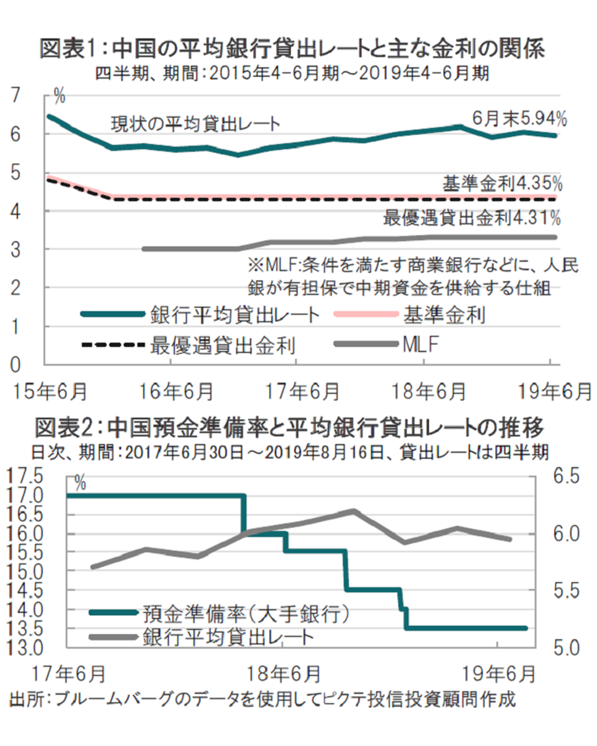 従来の問題点を別の角度から振り返ります。中国では米中貿易戦争が懸念された頃から、預金準備率の引き下げにより金融緩和が行われています。ただ、銀行の平均貸出レートと比較すると、貸出レートを引き下げる効果が十分とは言い切れない面が見られます(図表2参照)。貸出レートが決定される貸出市場と、資本市場のレートに隔たりがあることは問題として指摘されていました。