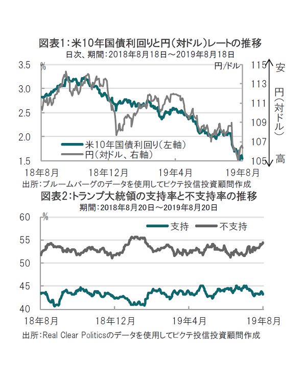 リーマンショック後で米10年国債利回りが1.5%台に低下したのは、欧州債務危機が悪化した12年、新興国通貨安などが懸念された16年となります。8月月初、やや唐突にトランプ大統領が意向を表明した中国からの輸入品に対する制裁関税に対する市場センチメントの悪化に米中貿易戦争の影響の大きさが改めて示されました。