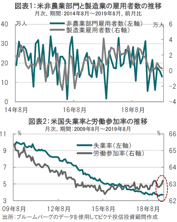 米労働省が2019年9月6日に発表した米国の8月雇用統計で、非農業部門雇用者数は前月比13万人増と、市場予想(16万人増)、前月(15.9万人増)を下回りました(図表1参照)。家計調査に基づく8月の失業率は3.7%でした。